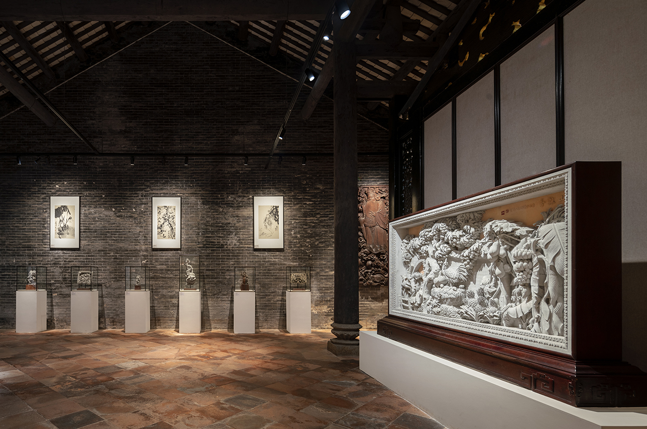 环顾馆内的各种挂画和砖木雕刻作品,不论浮雕亦或是镂空雕,都极具特色,细微入致;根据展品形态、大小、位置,选用多支投射灯搭配照明,使每处雕刻在光影的明暗对比下,尽显立体层次,惟妙惟肖,令人赏心悦目,叹为观止。