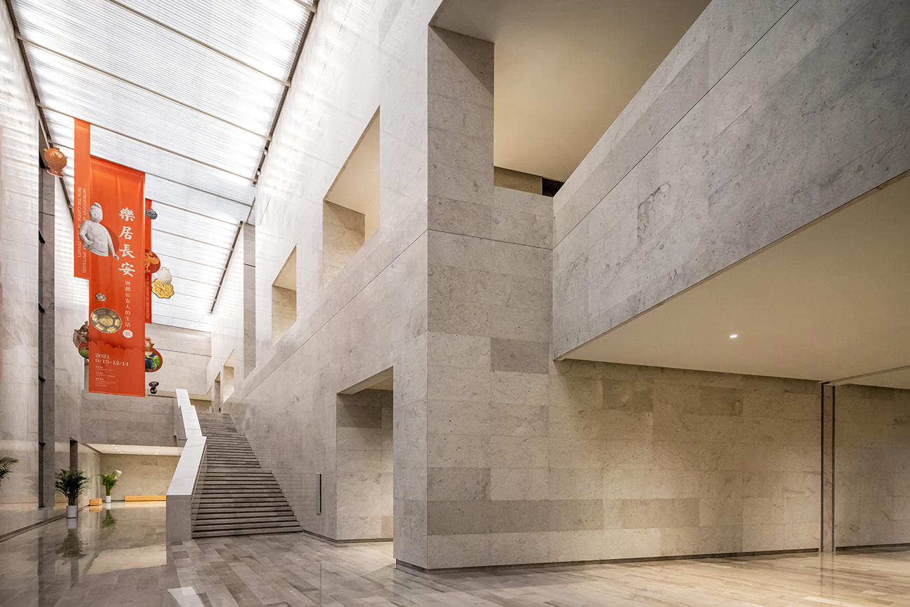展馆中央设有一个宽阔的中庭,是组织连接一、二层的主要空间,顶部以天窗采光,沿边安装摆动式射灯以洗亮挑高墙面,保证空间足够的亮度,将一层的观展人流引导至二楼展览空间。 漫步在博物馆宽敞明亮的过道,阳光透过玻璃的折面倾洒在墙面,建筑外形冷冽切割的线条配合着室内柔和的光线,体会到的是一种古老与现代交织的奇妙感受。